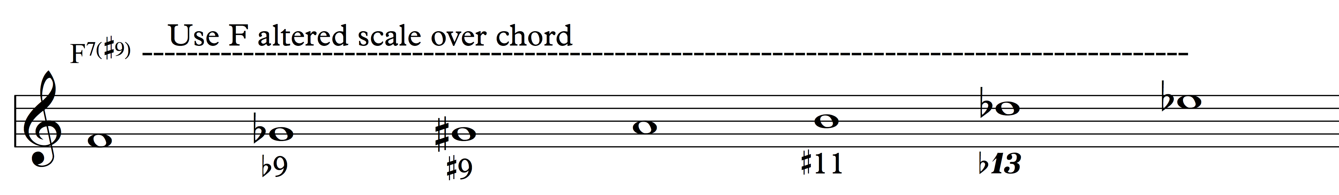 In this context, playing the F blues scale no longer works. Our solo is now more likely to be vertical (appropriate note choices over each individual chord). And this time the F7(#9) chord could, for example, support F altered scale: